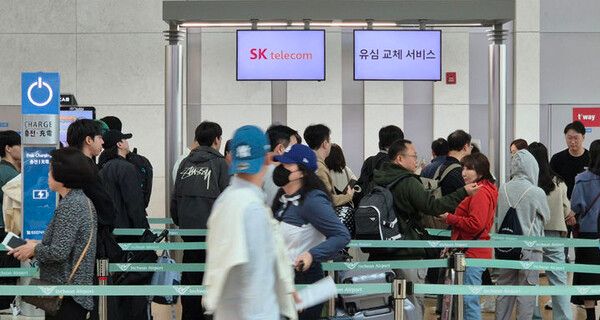 뉴시스 보도에 따르면, 30일 오전 인천공항 제1여객터미널 출국장 SK텔레콤 유심교체서비스 임시 창구에는 해외 출국 전 유심을 교체하려는 승객들이 긴 줄을 서며 대기시간은 얼마나 걸리는지 유심은 교체 받을 수 있는지 문의하는 모습이 눈에 띄었다.