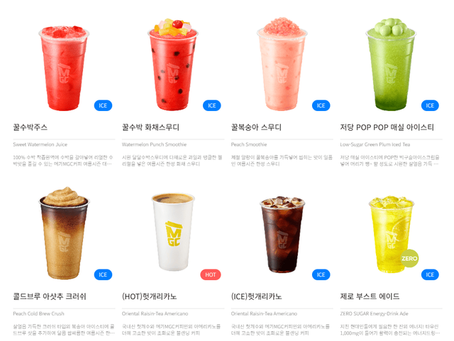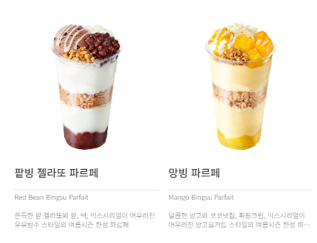이번 출시한 여름 시즌 메뉴는 꿀수박주스, 꿀수박 화채스무디, 꿀복숭아 스무디, 저당 POP POP 매실 아이스티, 콜드브루 아샷추 크러쉬, 팥빙 젤라또 파르페, 망빙 파르페, 멕시칸 치킨 퀘사디아 등 총 8종이다.