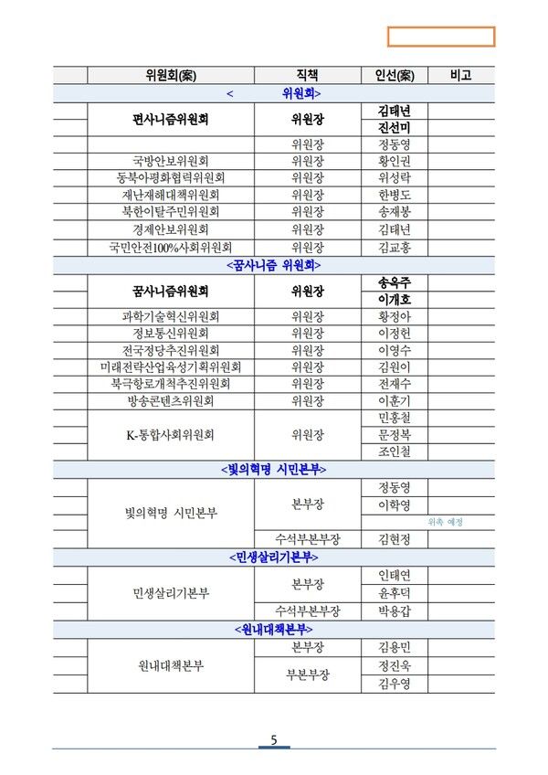 또 상황부실장은 윤건영, 공보 수석부단장 박수현, 대변인 한민수. 강유정, 노종면 의원 등이 역할을 한다.
