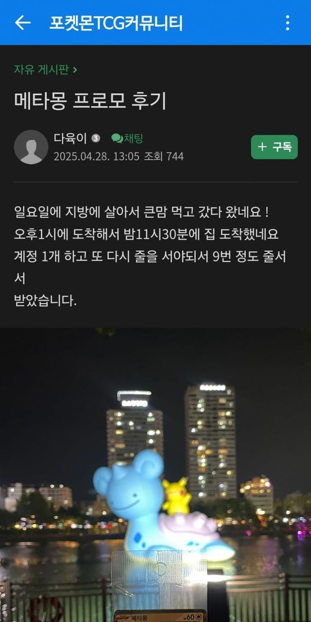 행사에 참여하면 무슨 포켓몬 프로모 카드를 무료로 증정하는데 라프라스랑 피카츄 와꾸에 메타몽 표정 그려져있어서 귀엽다고 인기폭발