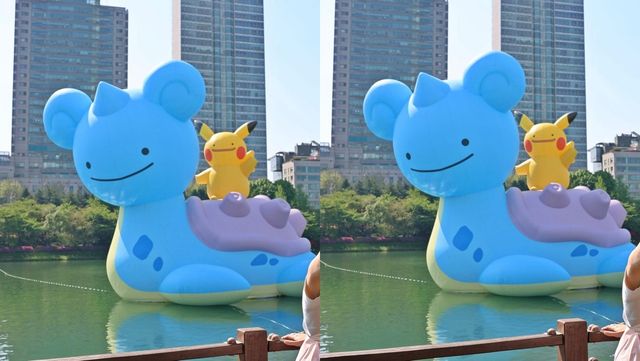 서울 잠실 롯데월드 인근 석촌호수에 압도적인 크기의 '라프라스'와 '피카츄' 캐릭터 모양 벌룬이 놓여 화제를 모으고 있다.