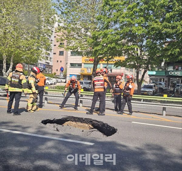 30일 소방당국과 강동구청 등에 따르면 이날 오후 3시35분쯤 서울 강동구 성내동의 길동사거리 인근 도로에서 폭 2.2m 깊이 1.5m의 대형 땅꺼짐이 발생했다.