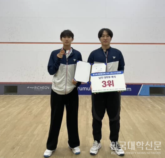 신안산대 스포츠지도학과 재학생인 남기태, 이건후 선수는 지난 17일부터 20일까지 전북 전주에서 열린 ‘제19회 회장배(전북) 전국 스쿼시 선수권 대회’ 남자 대학부 복식 부문에서 3위에 입상했다. 이번 대회는 대한스쿼시연맹이 주최하고, 전국에서 178명의 선수가 참가한 가운데 열띤 경쟁 속에서 치러졌다.