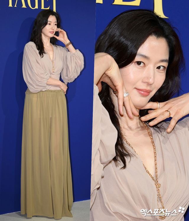 전지현은 부드러운 누드 톤의 시스루 롱 드레스를 착용해 고급스러운 분위기를 강조했다. 깊은 브이넥 라인과 풍성한 퍼프 슬리브가 어우러진 디자인은 전지현만의 우아한 무드를 배가시켰다.