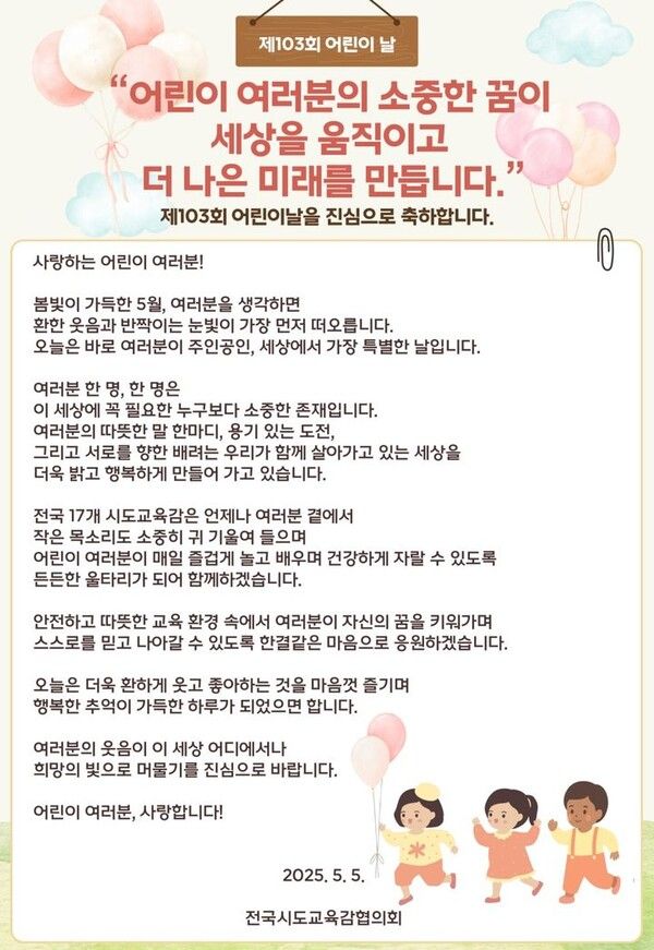 전국시도교육감협의회는 30일 제103회 어린이날을 앞두고 전국의 어린이들에게 진심 어린 축하와 응원의 편지를 전했다.
