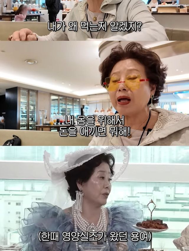 과거 영양실조와 뇌경색까지 겪은 것으로 알려진 선우용여는 "나는 당도 없다"며 80세의 나이에도 건강을 유지할 수 있는 비결이 호텔 조식이라고 밝혔고, 이어 "내 몸을 위해 돈을 아끼면 뭐 하냐. 옷은 7~800만 원, 천만 원까지 사더라. 입에 들어가는 건 아끼면 안 된다"라며 자신의 가치관을 공유했다.