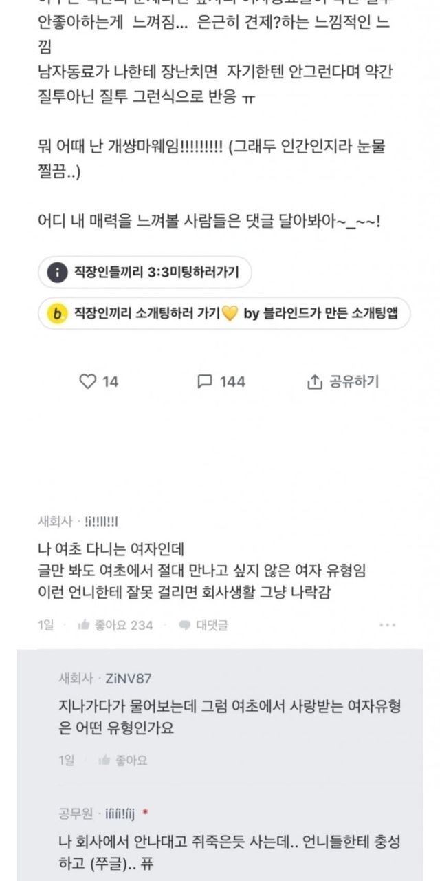 직장에서 남자동료들은 다 나한테 잘대해준당 히히