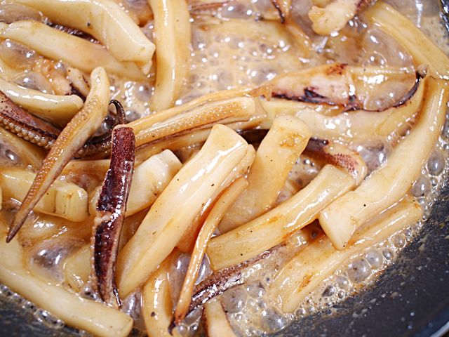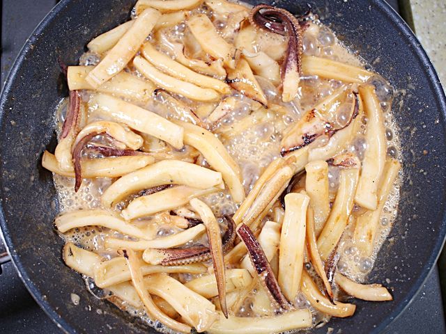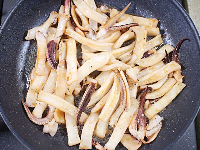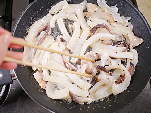오징어가 다 익으면 재빨리 접시에 옮겨 담아요.