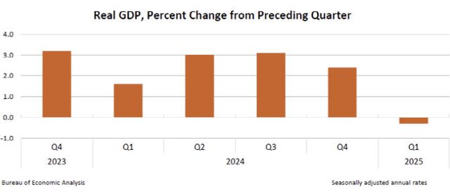 미국 경제분석국(BEA)가 발표에 따르면 1분기( 1~3월) 실질 국내총생산(GDP)은 전분기 대비 연율 기준으로 0.3% 감소했다. 지난해 4분기에는 GDP가 2.4% 증가한 점을 고려하면 미 경제가 크게 둔화한 것이다. 다우존스가 집계한 전문가 전망치(0.4%)도 크게 밑돌았다. 미국 경제가 분기 기준 역성장한 것은 지난 2022년 1분기(-1.0%) 이후 3년 만이다.
