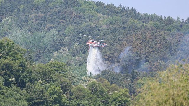 대구 북구 함지산 산불 진화 작전에 투입된 산림청 산불 진화용 헬기가 함지산 상공에서 물을 뿌리고 있다. / 뉴스1