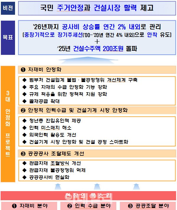 우선 정부는 건설자재 수급 안정화를 위해 불법행위 점검, 민관 협의체 운영 등 통해 시장의 가격결정 기능을 지원하고, 규제 개선으로 공사비 상승압력을 완화할 방침이다.