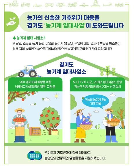 이에 경기도는 29개 농기계 임대사업소를 중심으로 지역 농업인의 수요를 파악하고 필요한 농기계를 임대하고 있다. 올해는 이상저온으로 인한 과수 냉해 피해 예방을 위해 이동형 열풍 방산팬 53대를 구입해 과수 농가들이 안정적으로 생산을 이어갈 수 있도록 지원하고 있다.