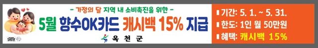 [파이낸셜경제=김영란 기자] 옥천군이 가정의 달 5월을 맞아 한달 동안 옥천사랑상품권(향수OK카드) 캐시백 혜택을 당초 10%에서 15%로 상향한다.