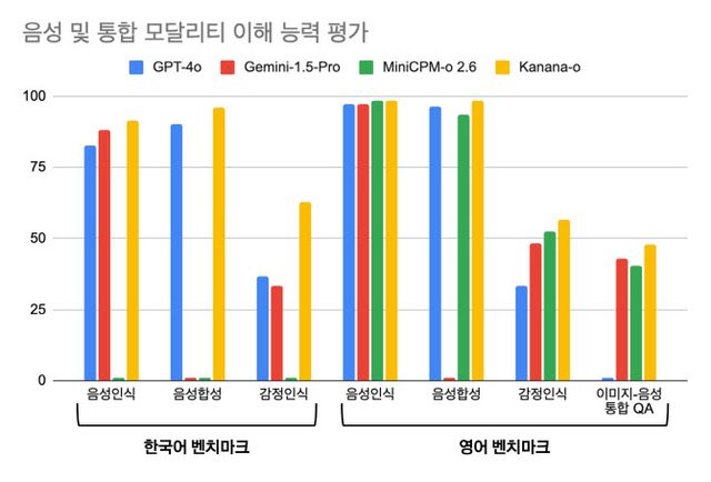 Kanana-o는 한국어 및 영어 벤치마크 테스트에서 글로벌 최고 수준의 성능을 기록했으며, 특히 감정인식 분야에서는 영어·한국어 모두에서 압도적인 성능을 보였다. 이미지와 음성을 종합적으로 이해하는 이미지-음성 질의응답(QA) 태스크에서도 탁월한 성능을 입증했다.