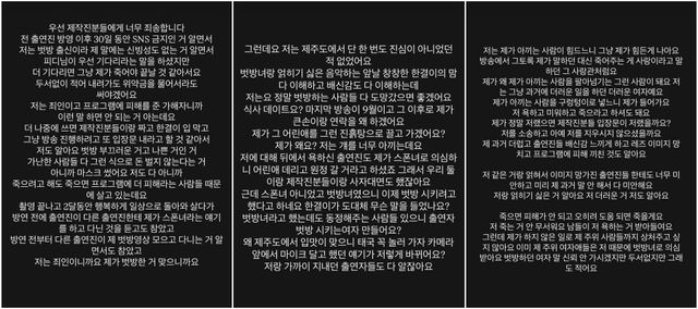 그는 "촬영 끝나고 두 달 동안 행복하게 일상으로 돌아와 살다가 방영 전 출연진이 다른 출연진한테 제가 스폰녀라는 이야기를 하고 다닌 것을 듣고도 참았고, 방영 전부터 다른 출연진이 제 벗방 영상 모으고 다니는 거 알면서도 참았다"라며 "그런데 저는 제주도에서 단 한 번도 진심이 아니었던 적이 없엇어요. 벗방녀랑 얽히기 싫은 마음 다 이해하고 배신감도 이해하는데, 식사 데이트요? 제가 그 어린애를 그런 진흙탕으로 끌고 가겠어요? 제가 왜요? 저는 걔를 너무 아끼는데요"라고 반박했다.