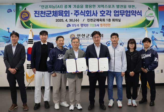 인공지능(AI) 스포츠 미디어 플랫폼 호각(대표 전영생)과 진천군체육회(회장 김명식)가 'AI 기술을 활용한 생활체육 및 지역 스포츠 발전'을 위한 업무협약을 체결했다.