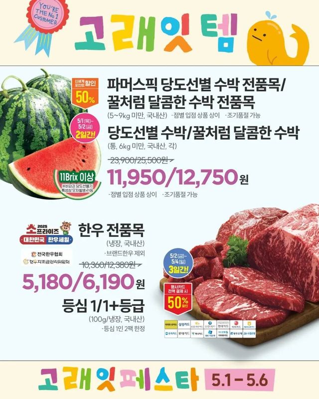 육류 소비자들을 위한 ‘고기파티’도 마련됐다. 6일간 진행되는 행사 기간 동안 프라임 등급의 미국산 윗등심살과 척아이롤이 100g당 각각 1990원, 1790원에 판매된다. 국산 돼지고기 부위인 항정살, 등심덧살, 등갈비는 행사카드 결제 시 40% 할인된 100g당 1788원에 구입 가능하다. 특히 2~4일 사이에는 행사카드 전액 결제 시 한우 전 품목 50% 할인이라는 파격 혜택도 제공된다.