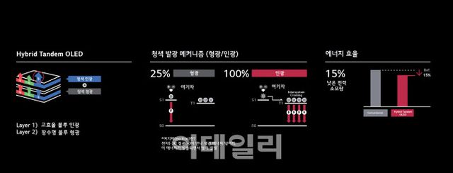 LG디스플레이는 아래층에는 청색 형광 물질을, 위층에는 청색 인광을 쌓는 하이브리드 투 스택 탠덤(2 Stack Tandem) 구조로 이 문제를 해결했다. 형광 방식의 장점인 안정성과 인광 방식의 장점인 저전력을 더해 기존 OLED 패널 수준의 안정성을 유지하면서 전력 소모량은 15% 가량 절감한 것이다.