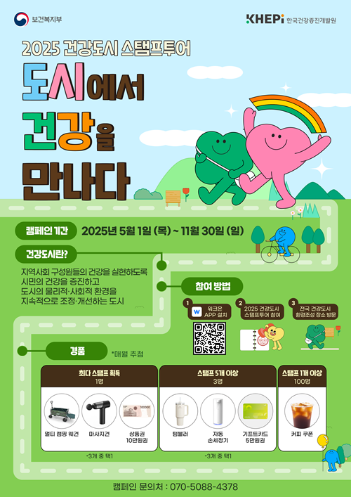 보건복지부와 한국건강증진개발원이 이달 1일부터 11월 30일까지 ‘2025 건강도시 도장 찍기 여행(스탬프투어), 도시에서 건강을 만나다’ 캠페인을 추진한다고 밝혔다.