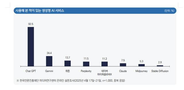 사용자들이 가장 많이 활용한 AI는 챗GPT(92.5%)였으며, 뒤를 이어 Gemini(24.4%), 뤼튼(13.7%), Perplexity(11.5%), 하이퍼클로바X(11.2%) 순이었다.