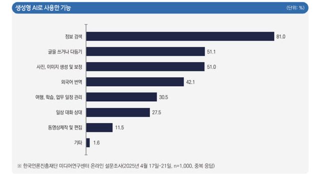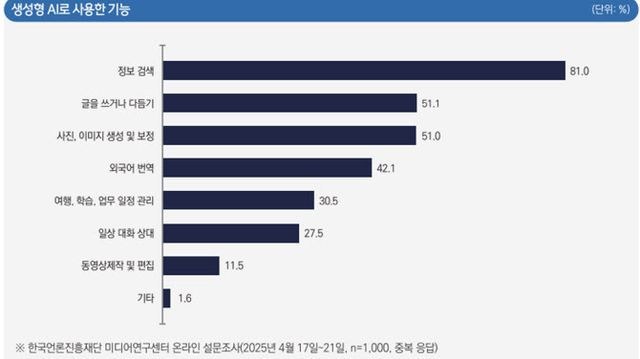 본 조사 결과는 한국언론진흥재단 미디어연구센터가 2025년 4월 17~21일, 생성형 AI 최근 이용자 1000명을 대상으로 진행한 <미디어서베이 2025년 2호> 를 바탕으로 작성됐다.