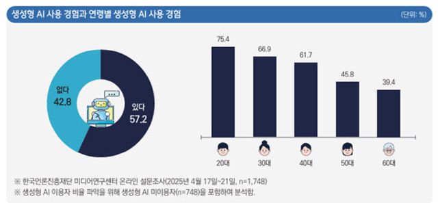 한국언론진흥재단 미디어연구센터가 발표한 ‘미디어서베이 2025년 2호: 지브리 스타일, 생성형 AI에 대한 인식을 바꾸다’ 보고서에 따르면, 생성형 AI를 사용한 사람은 전체 응답자의 57.2%에 달하며, 이 가운데 절반 이상(54.9%)은 2025년에 처음 이용한 것으로 조사됐다.