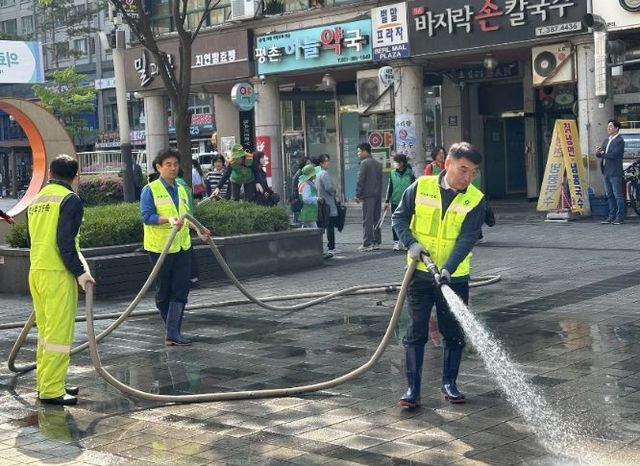 [와이뉴스] 안양시는 지난 16일부터 30일까지 동안구 내 주요 상권인 평촌1번가 문화의거리(범계로데오거리), 관양시장, 평촌역 일대에서 새봄 맞이 물청소를 실시했다고 1일 밝혔다. 이는 겨우내 쌓인 미세먼지와 찌든 때 및 쓰레기를 제거하여 쾌적한 환경을 조성하고, 나아가 지역경제에 활력을 불어넣기 위해 진행됐다.