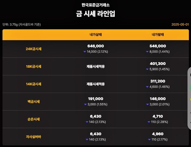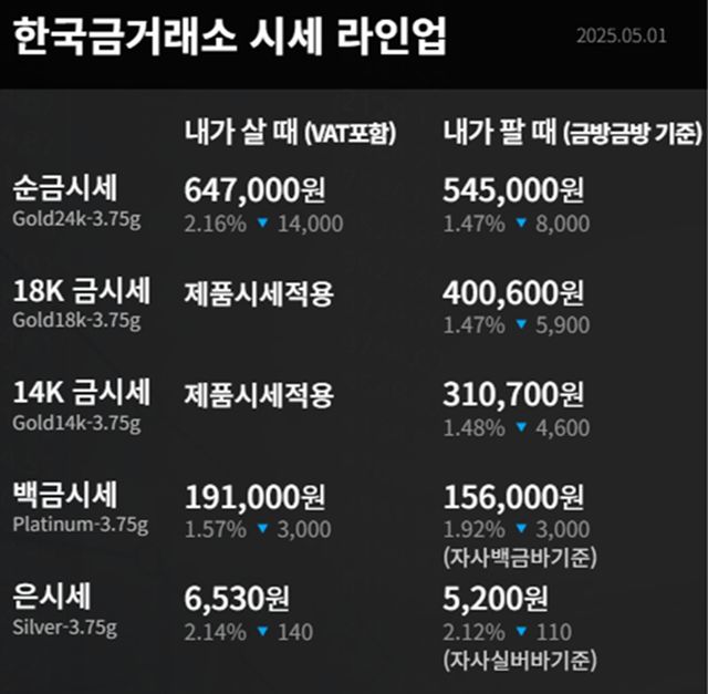 순금(24K) : 매입가 64만 7000원 / 매도가 54만 5000원