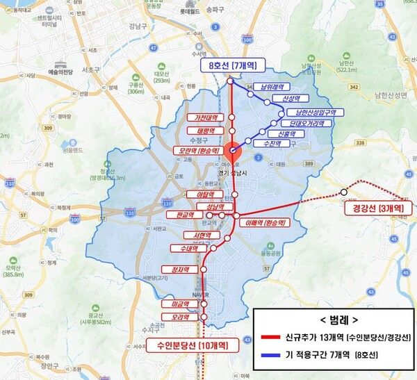 뉴시스 보도에 따르면, 서울시에 따르면 기존 성남시 구간에서 이용가능했던 8호선 7개 역사(모란~남위례역)에 이번 확대 구간을 포함하면 성남시에서 '기후동행카드'의 이용이 가능한 지하철역은 20개 역사로 확대된다.