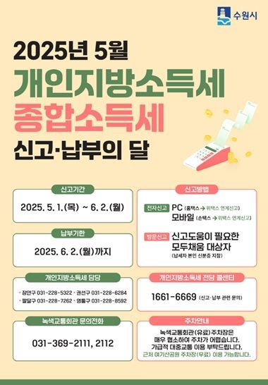 이를 위해, ‘모두채움 안내문’을 받은 납세자가 편리하게 신고할 수 있도록 5월 2일부터 6월 2일까지 수원시녹색교통회관(일월로22번길 23)에서 ‘종합소득세·개인지방소득세 원스톱 합동 신고센터’를 운영한다.