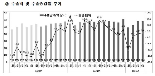 산업통상자원부가 1일 발표한 ‘2025년 4월 수출입 동향’에 따르면 지난달 한국 수출액은 582억 1000만달러(통관기준 잠정치)로 지난해 같은 기간보다 3.7% 증가했다. 3개월 연속 증가세다.