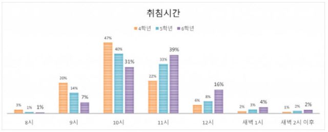 6학년의 30%는 모든 일정을 마친 뒤 오후 8시 이후에야 귀가한다고 응답했으며, 4%는 오후 10시 이후 귀가하는 것으로 나타났다. 반면 어린이의 70%가 오후 4~6시 사이를 적절한 귀가 시간으로 생각하고 있었다.