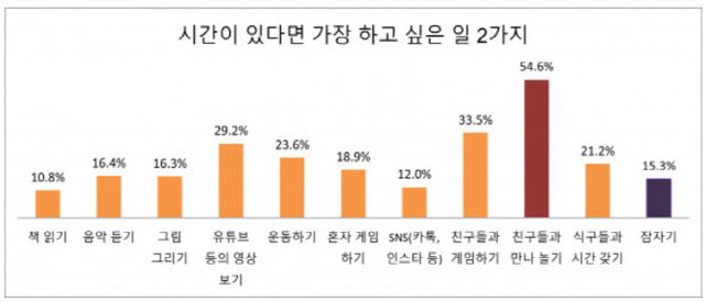 이 조사에 따르면 전체 응답자의 62%가 하루 2시간 이하만 놀 수 있다고 응답했으며, 15.8%는 1시간도 채 되지 않는다고 답했다. 시간이 생기면 하고 싶은 활동으로는 ‘친구들과 만나 놀기’(54.6%), ‘친구들과 게임하기’(33.5%)가 가장 높았다.