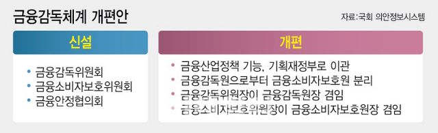 금융감독체계 개혁 방안은 김현정 민주당 의원이 대표 발의한 ‘금융위원회의 설치 등에 관한 법률’ 개정안을 기초로 논의했다. 김 의원이 발의한 개정안의 핵심은 국무총리 소속의 ‘금융감독위원회’와 ‘금융소비자보호위원회’를 설치하고 금융정책기능은 기획재정부로 이관해 현 금융당국의 기능을 시장감독에 집중한다는 것이다.