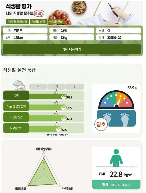 개인이 자신의 연령에 맞는 문항에 응답하면, 총점(100점 만점)과 함께 '상·중·하' 3단계 등급으로 자신의 식생활 수준을 확인할 수 있다. 전국 평균 점수도 함께 제시돼 비교가 가능하다.