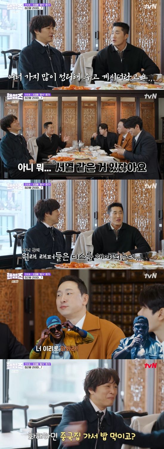 차태현은 "(화해하면) 중국집 가서 밥 먹이고?"라며 능청을 떨었고, 라이머는 "같이 한잔 먹고 '힙합은 원 러브(One Love)다' 같이 이렇게 하고"라며 맞장구쳤다. 이이경은 "중재자 하면서 솔로몬 하면서 평화를 지키기 위한 거네"라며 감탄했다.