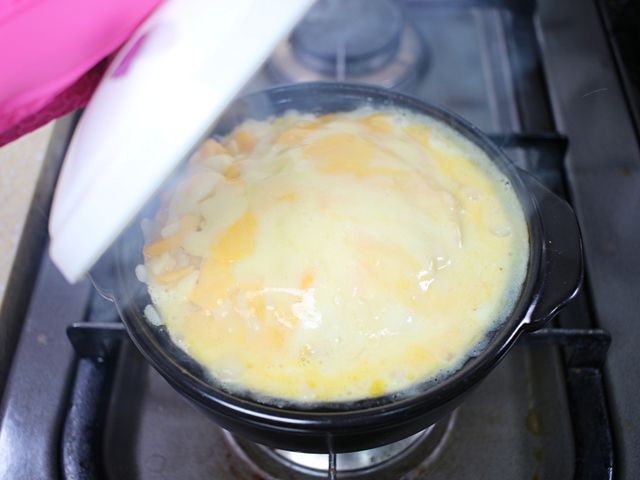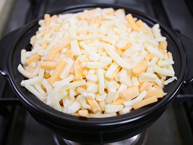 뚝배기 뚜껑을 닫고 약불로 은근하게 치즈를 녹여주세요.