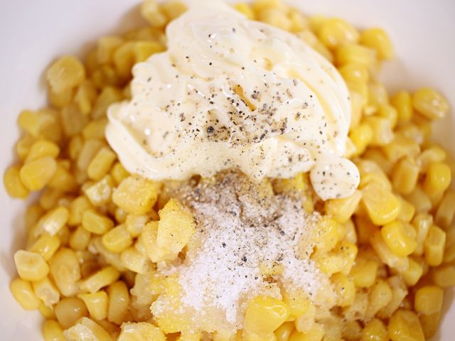 계란 위에 양념한 옥수수를 푸짐하게 올리고
