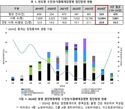 2024년 수인성·식품매개감염병 집단발생 건수는 총 529건으로, 지난 5년(2019~2023년) 평균(479건) 대비 10.4% 증가했다.