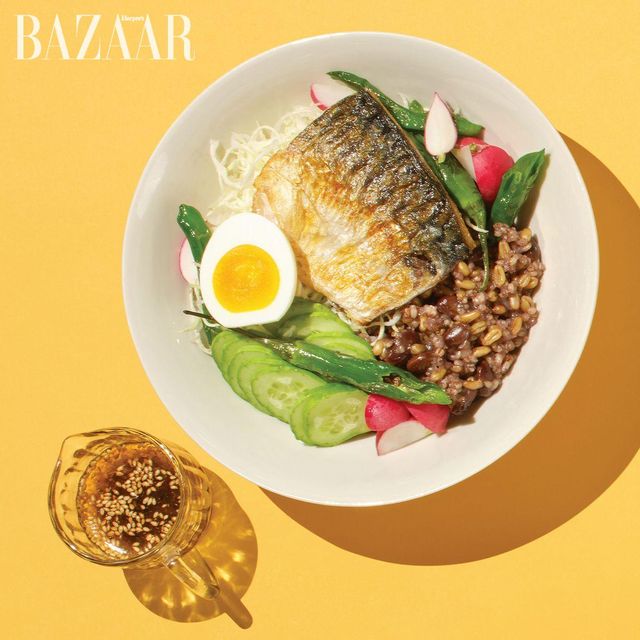 오메가-3가 풍부한 고등어에 항산화와 해독 작용을 돕는 채소, 저혈당 잡곡이 어우러져 건강한 한 끼를 완성한다. 고등어 대신 두부를 사용하여 비건식으로도 즐길 수 있다.