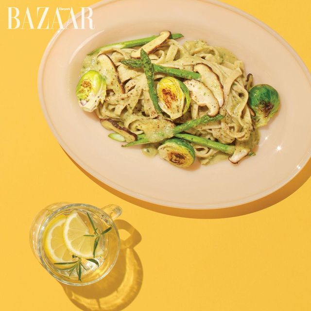 재료(2인분 기준) 캔 병아리콩 600g, 생바질잎 25g, 귀리 우유 400ml, 통밀 파스타 220g, 아스파라거스 6개, 방울양배추 3개, 표고버섯 2개, 올리브 오일 2큰술, 소금·후추 약간, 생바질잎(가니시용)