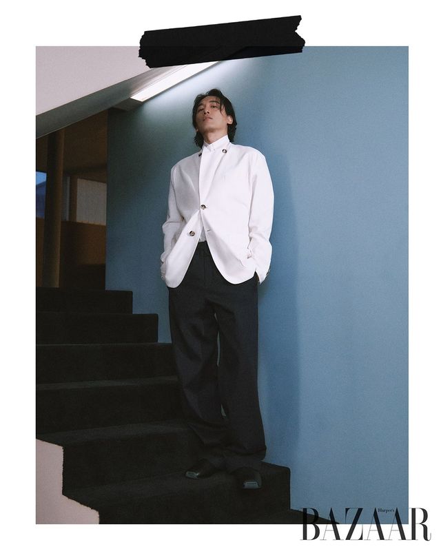 재킷, 칼라 장식 셔츠, 팬츠는 모두 Hermès.