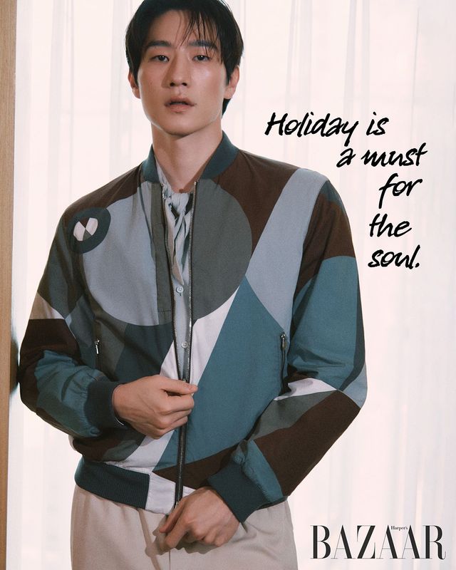 바시티 재킷, 톱, 팬츠, 샌들은 모두 Hermès.
