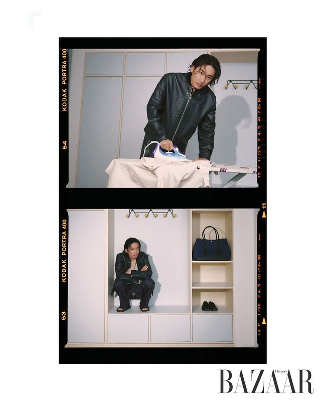 레더 재킷, 톱, 팬츠, 목걸이, 샌들, 다리미판 위에 놓인 화이트 재킷, 선반에 놓인 ‘가든 파티’ 백, 플랫 슈즈는 모두 Hermès.