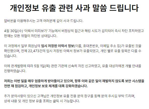 알바몬 개인정보 유출 여부와 범위에 대해서는 알바몬 홈페이지를 통해서 확인할 수 있다.