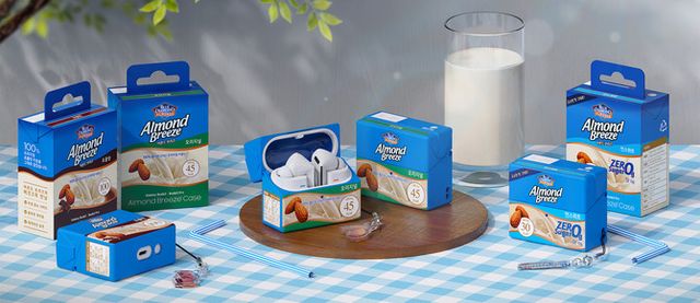 아몬드브리즈 케이스는 실제 아몬드브리즈 음료의 사각 패키지를 특징을 그대로 재현했다. 컬러, 질감, 라벨 요소 등의 디테일도 함께 구현해 클래식하면서도 귀여운 디자인을 완성했다는 설명.
