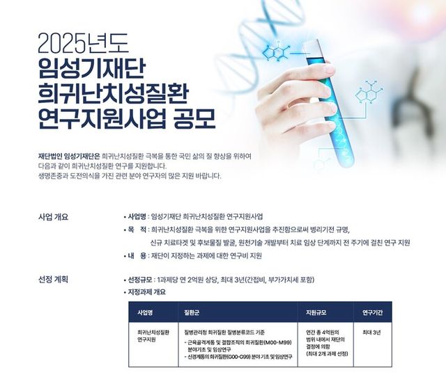 임성기재단은 연구 공모 분야를 ‘근육골격계통, 결합조직, 신경계통의 희귀질환에 대한 기초 및 임상연구’로 선정했다. 이 분야는 병리적 메커니즘이 아직 충분히 규명되지 않은 상태에서 새로운 접근을 통해 환자들의 삶에 획기적 변화를 가져올 수 있는 연구 영역으로 평가된다.