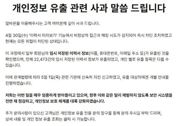 하지만 이 과정에서 일부 회원의 임시 저장된 이력서 정보 2만 2473건이 유출된 것으로 확인됐다. 이력서 정보에는 이름, 휴대폰 번호, 이메일 주소 등이 담긴 것으로 확인됐다. 아이디와 비밀번호는 유출되지 않은 것으로 나타났다.
