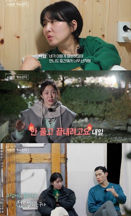 어색한 기류 속, 여성 출연자들은 “다 같이 밥 먹으며 좀 풀자”라고 중지를 모았다. 이때 백합은 혼자 방안에 있는 10기 영식을 찾아가 “콘셉트 이상해졌어, 왜 이래?”라며 그를 밖으로 끌어내려 했다.