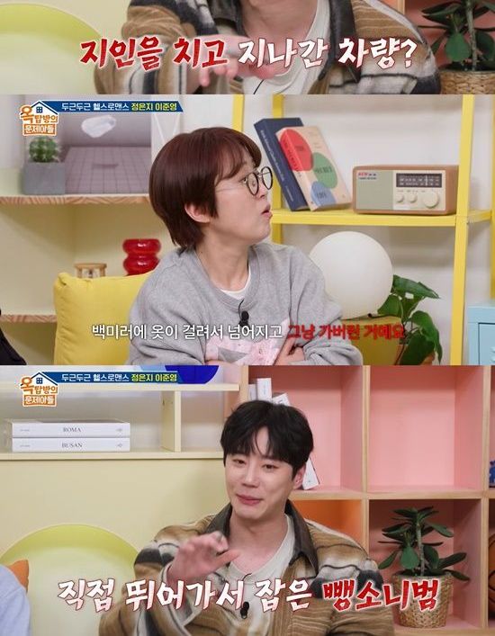 송은이가 "옛날에도 또 뭐 있지 않았냐"고 묻자 이준영은 "지인이랑 야장에서 술을 한 잔 하고 있었는데 차가 지인을 치고 갔다. 세게 친 건 아니고 백미러에 옷이 걸려서 넘어졌는데 그냥 가 버린거다. 뛰어가서 차를 잡았다. 운전자 분은 모르셨다더라"고 설명했다.